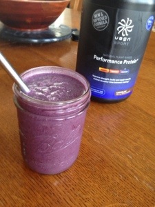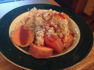 After my run I made a recovery smoothie with a scoop of Vega protein powder, frozen berries, maca powder, chia seeds, coconut flakes and water. Delish!!!! And later for dinner I had a very basic dish of quinoa and a boiled sweet potato with basil and hot sauce. I love keeping healthy dishes simple and spicy!!
