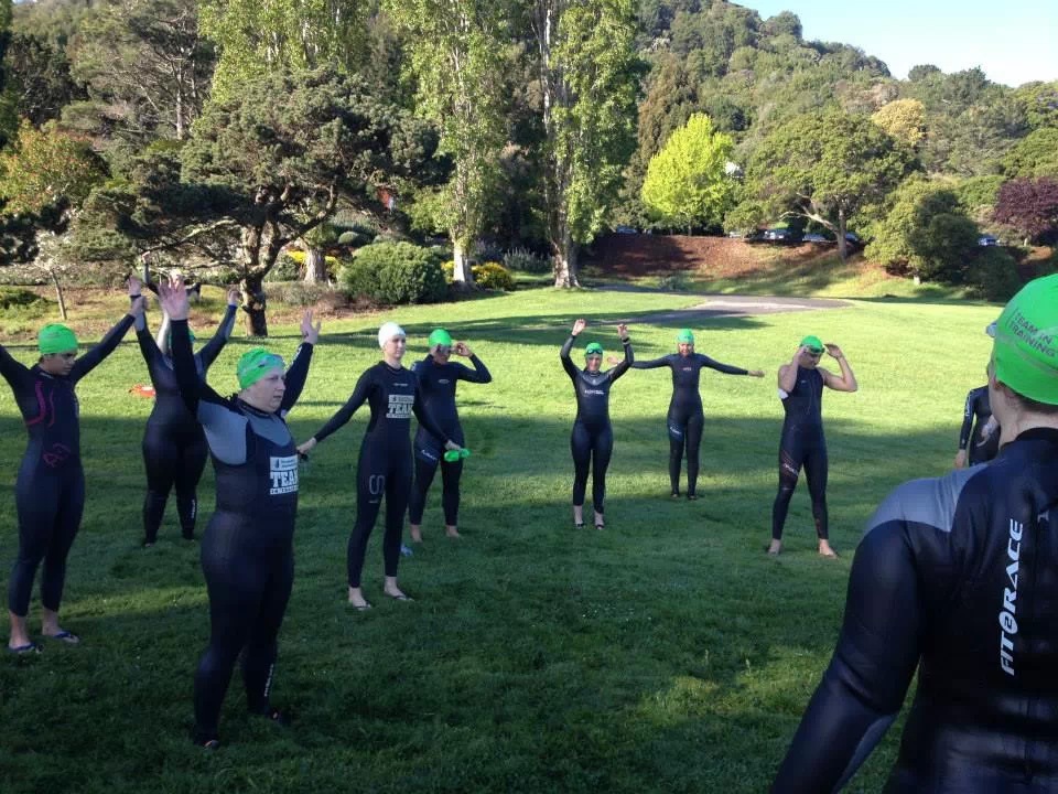 Sunday we did a practice triathlon consisting of a 1 mile swim, 26 mile bike, 6 mile run which is pretty much an Olympic distance race. We met at Paradise beach at 7:45am and tried to stay warm in the 47 degree weather while we got our transition areas set up. Our coaches designed the day to be as close to race day as possible. They had racking bars for our bikes, we got our age and race bib number markered on our bodies, we all had the same color swim cap, they had photographers, course support, and even finish line tape! Major kudos to everyone that helped pull the event together — you did an amazing job!!