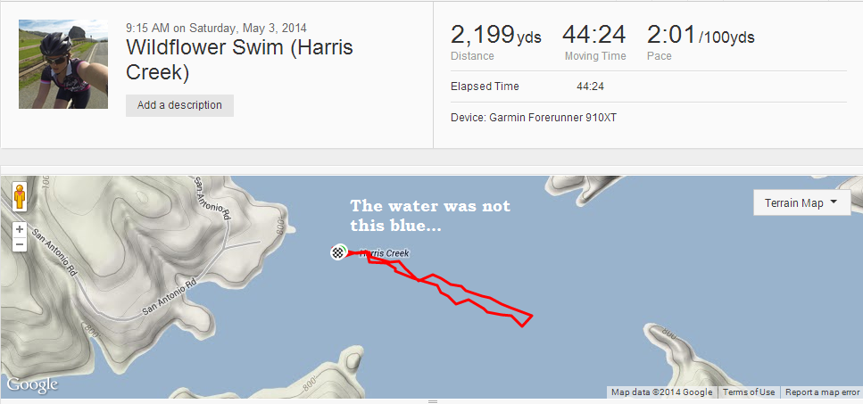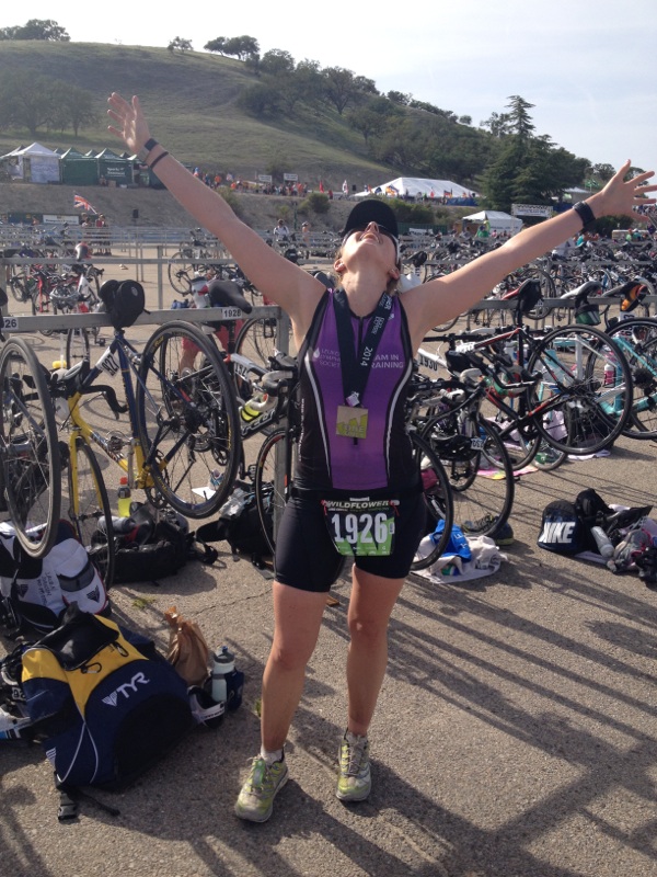 This was certainly a unique year at the “one and only” Wildflower triathlon: a new swim location, a slightly new run course, new bike racking procedures, and a whole new spin on the triathlon itself (swim, run, bike, run!). And to be honest, I enjoyed the changes! OK that steep boat ramp was killer and yes, the water was black… but I really liked warming up my legs during the 2.2 mile transition run to my bike. And I especially loved having “only” 11 miles to run instead of 13 after the hilly bike ride at the hottest point of the day. The race organizers did a great job communicating the changes and coordinating all of the volunteers and shuttles. Bravo!