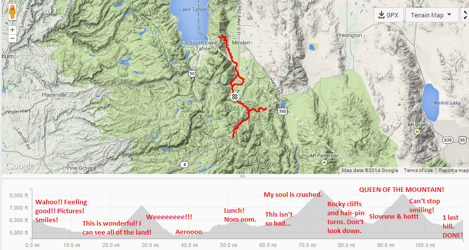 The night before the race I still hadn’t decided what I was going to do. I started talking it over with a couple GGTC people and we realized that 64 miles wouldn’t be quite enough to prep for Death Ride in 2 weeks, and I also knew that Tami was doing the 110 by herself and didn’t want her to be solo. Plus I love a good challenge as much as I love cycling. So on the morning of the ride the kind race organizers bumped me up to the Century and gave me the appropriate route map.