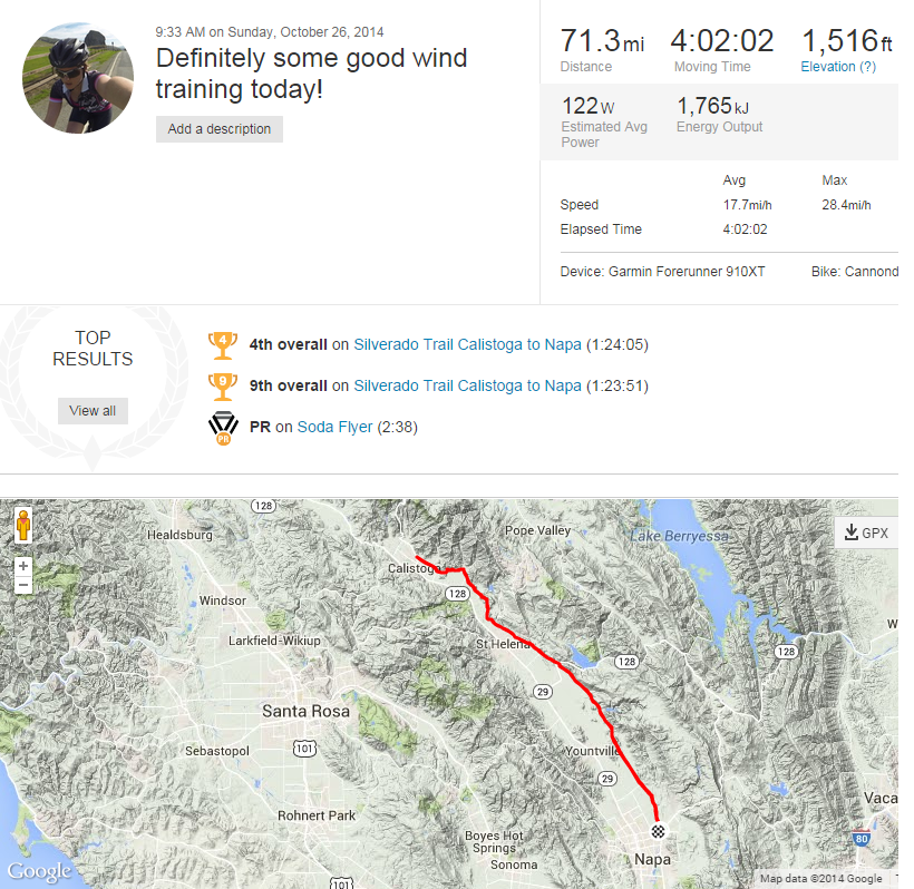 Sunday morning I was back in Napa doing the Silverado Trail (yes… again). My training plan called for a 4 hour ride on flat to rolling hills so that’s what I did. I ended up doing 71 miles in that time which is ~17.7mph. Mot my best effort but I’ll take it. It was SO windy going North which made the first 26 miles very slow and mentally challenging. Just to put it in perspective, the first 26 miles was an average of 16.6 mph and the way back was 19.9 mph. What a difference a tailwind makes! This is amazing training for IM Cozumel because that’s exactly the type of conditions we’ll face. Although the race is a circle so we’ll have strong headwinds, crosswinds, and tailwinds.