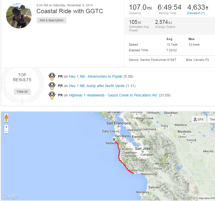 We started in Montara and the route was simple — bike ~3.5 hours South on Highway 1 then turn around and come back. I almost made it to Santa Cruz before turning around.