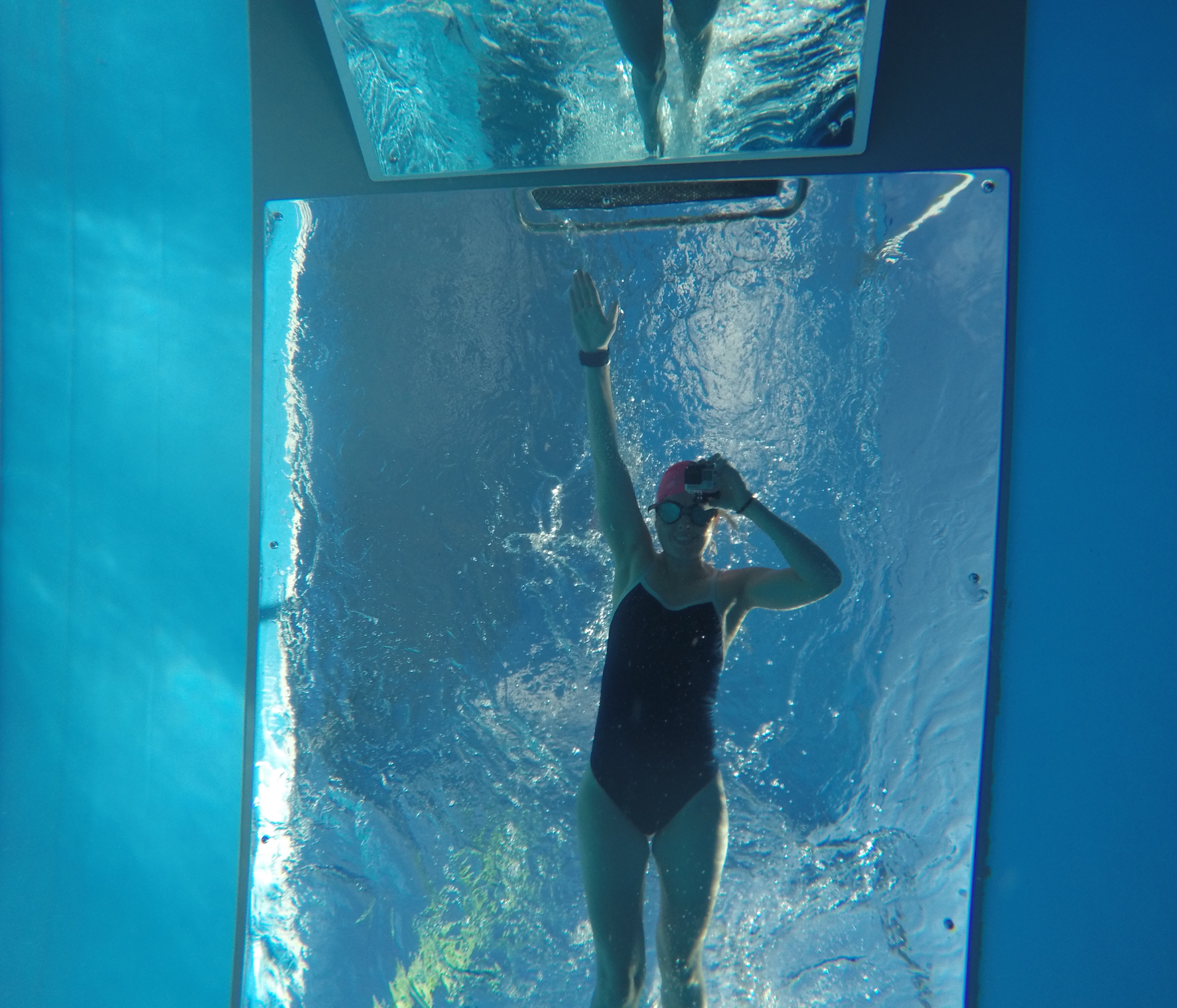 After the short ocean swim I stumbled upon the friendly Endless Pool folks and they asked if I wanted to swim. “Yes!! But how much does it cost?” “Cost? It’s free! In fact, we pay YOU in free samples and coffee!” Done. β It was so much fun. Way better than the ocean!